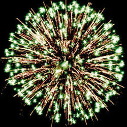 Разноцветные кометы, золотые с цветными искрами трассы разрываются сферами из золотых трещащих форсов и мерцающих огней.