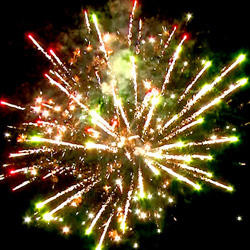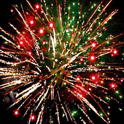 Множество золотых и серебряных ниспадающих нитей, мерцание. Разноцветные звезды с пышными хвостами и треск. Цветные сферы и кометы с трещащими хвостами.