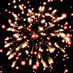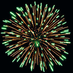 Разноцветные кометы разрываются сферами из цветных мерцающих огней, золотых, коротких трещащих форсов и трещащих огней.
