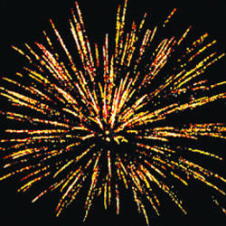 Множество золотых ниспадающих нитей (парча). Зеленая сфера (пион) и треск. Белая мерцающая сфера (мерцающий пион).