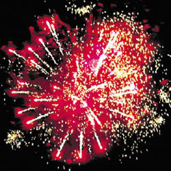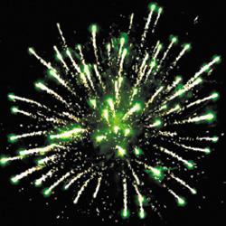 Фонтан: - крупные белые трещащие вспышки и красно-зеленые огни. Красные звезды с пышными хвостами (кокос) и трещащая хризантема. Синие звезды с пышными хвостами (кокос) и трещащая хризантема. Зеленые звезды с пышными хвостами (кокос) и трещащая хризантема.