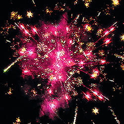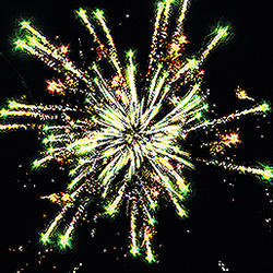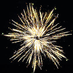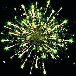Разноцветные кометы разрываются сферами из: серебряных форсов с красными огнями на концах и множества золотых трещащих сфер; серебряных форсов с зелеными огнями на концах и множества золотых трещащих сфер; фиолетовых и зеленых мерцающих огней; серебряных форсов с желтыми огнями на концах и множества золотых трещащих сфер; золотых форсов и множества серебряных трещащих сфер.