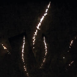 Разноцветные сферы и мерцающие разрывы переходят в белые хлопья. Цветные звезды с пышными хвостами. Свист. Множество золотых ниспадающих нитей.