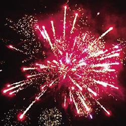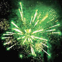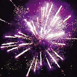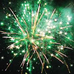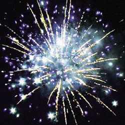 Множество серебряных ниспадающих нитей (парча), красные звезды и белое мерцание. Красные звезды с пышными хвостами (кокос) и облако треска (трещащая хризантема). Множество серебряных ниспадающих нитей (парча), зеленые звезды и белое мерцание. Зеленые звезды с пышными хвостами (кокос) и облако треска (трещащая хризантема). Множество серебряных ниспадающих нитей (парча), синие звезды и белое мерцание. Фиолетовые звезды с пышными хвостами (кокос) и облако треска (трещащая хризантема). Зелено-сине-красная сфера (пион) и облако треска (трещащая хризантема).