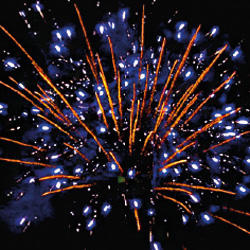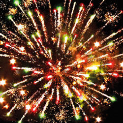Цветная сфера, мерцающий разрыв переходит в белые хлопья. Разноцветные звезды с пышными хвостами. Множество золотых ниспадающих нитей. Облако треска.