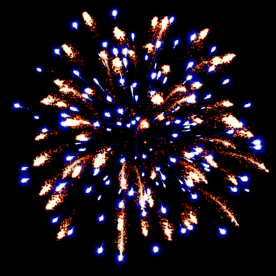 Разноцветные кометы разрываются сферами из: Золотых мерцающих огней и золотых искристых форсов. Золотых форсов, разлетающихся трещащих искр, красных и зеленых огней. Синих огней и золотых искристых форсов. Множества трещащих огней.