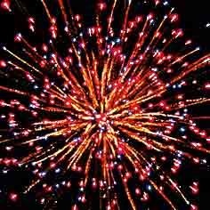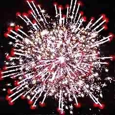 Красные звезды с белыми, золотыми хвостами, красным и белым мерцанием. Красные и синие мигающие звезды с белыми и золотыми хвостами, облако трещащих разрывов. Красочная концовка: залп из всех эффектов.