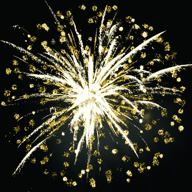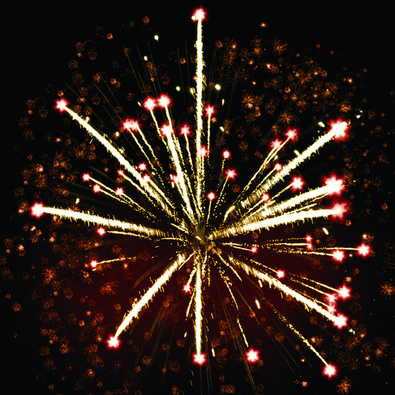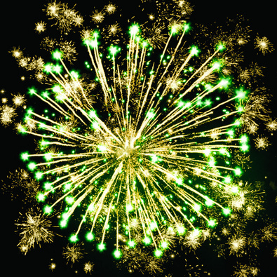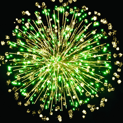 Разноцветные кометы разрываются сферами из золотых парчевых форсов с трещащими искрами на концах и цветных мерцающих огней. Множеством трещащих огней, сфер.