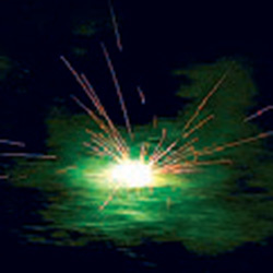 Вертится, разлетается трещащими искрами. Образует круг красного, зеленого и желтого огня.