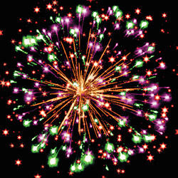 Разноцветные кометы разрываются сферами из золотых форсов с цветными огнями на концах и множеством трещащих сфер.