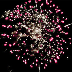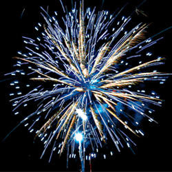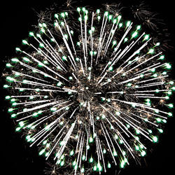 Разноцветные кометы разрываются сферами из серебряных форсов, цветных мерцающих огней и множества трещащих сфер.