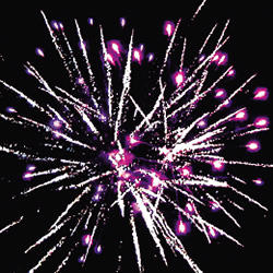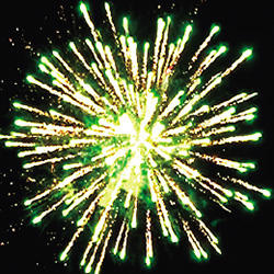 Множество золотых ниспадающих нитей (парча) и красное мерцание. Красные звезды с пышными хвостами (кокос) и белое мерцание. Множество золотых ниспадающих нитей (парча) и синие звезды. Сине-золотая мерцающая сфера (пион). Зеленые звезды с пышными хвостами (кокос) и треск. Множество серебряных ниспадающих нитей (парча) и фиолетовые звезды. Красочная концовка. ЗАЛП: Красная сфера (пион) и облако треска (трещащий дождь).