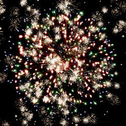 Разноцветные кометы разрываются сферами из цветных мерцающих огней, форсов с серебряными трещащими искрами и множеством трещащих сфер.