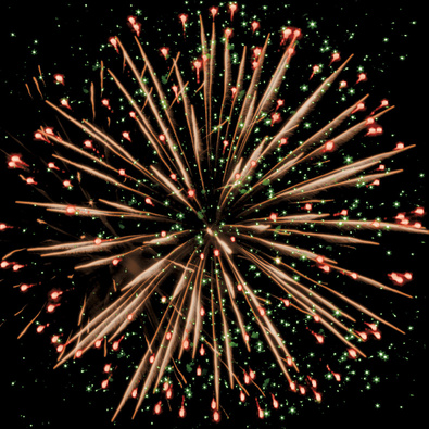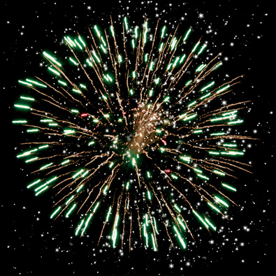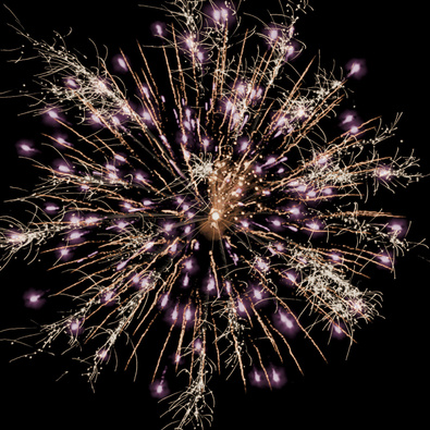 Разноцветные кометы разрываются сферами из золотых форсов с цветными огнями на концах, мерцающих огней и множества трещащих сфер.