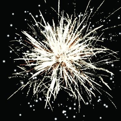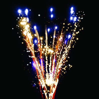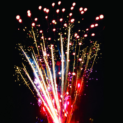 Веерные золотые трассы с серебряными трещащими и золотыми искрами и цветные огни. Разноцветные кометы разрываются сферами из золотых искристых форсов и цветных мерцающих огней.