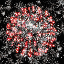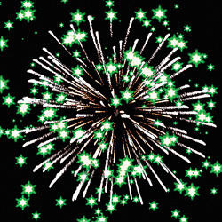 Разноцветные кометы разрываются сферами из цветных мерцающих огней, серебряных форсов и трещащих огней.