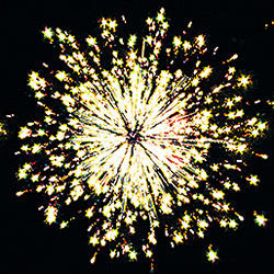 Разноцветные кометы разрываются сферами из: синих и золотых мерцающих огней; золотых форсов и множества трещащих золотых сфер.