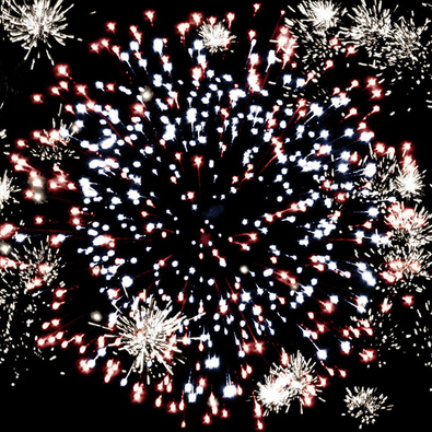 Разноцветные кометы разрываются сферами из цветных мерцающих огней и серебряных трещащих искр.