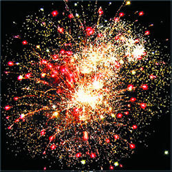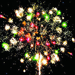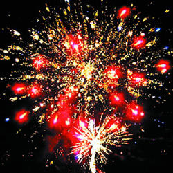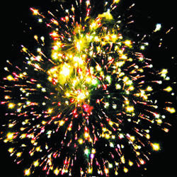 Красно-синяя сфера (пион) и белое мерцание. Трещащая комета разрывается красно-синей сферой (пион) и облаком треска (трещащая хризантема). Сине-фиолетовая сфера (пион) и белое мерцание. Трещащая комета разрывается зелено-фиолетовой сферой (пион) и облаком треска (трещащая хризантема). Желто-фиолетовая сфера (пион) и белое мерцание. Красная сфера (пион) и облако треска (трещащая хризантема).