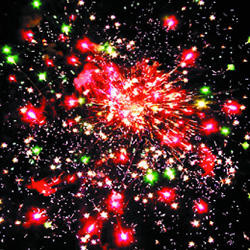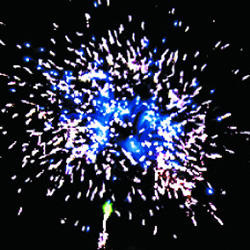 Множество серебряных ниспадающих нитей (парча) и красное мерцание. Зелено-синие звезды и треск. Мерцающие золотые хвосты (мерцающая ива) и фиолетовые звезды. Множество серебряных ниспадающих нитей (парча) и зеленые звезды. Разрыв шуршащими хвостами (снежные хлопья) и белая мерцающая сфера (пион).