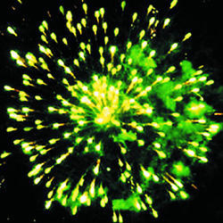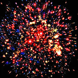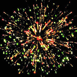 Разрыв красными звездами с пышными хвостами (кокос) и белое мерцание. Разрыв зелеными звездами с пышными хвостами (кокос) с треском. Фиолетово-зеленое мерцание (пион). Красно-синий сферический разрыв (пион) и облако трещащих разрывов (трещащий дождь). Красочная концовка: Множество серебряных ниспадающих нитей (парча) и красное мерцание.