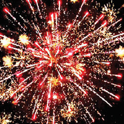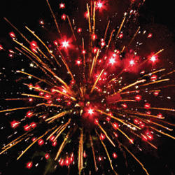Разноцветная мерцающая сфера. Цветные звезды с пышными хвостами и облако треска. Разрыв трещащими хвостами.