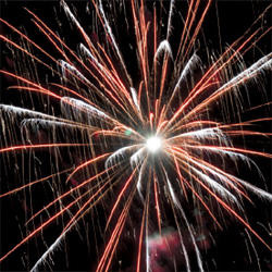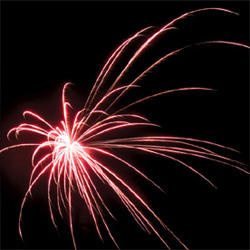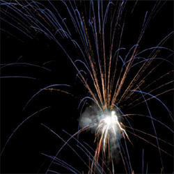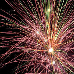Разноцветные кометы разрываются сферами из цветных мерцающих и трещащих огней с золотыми и серебряными форсами.