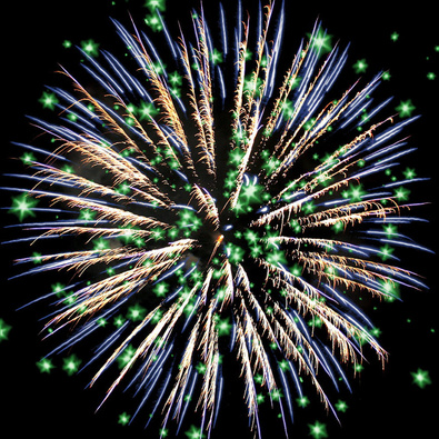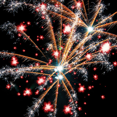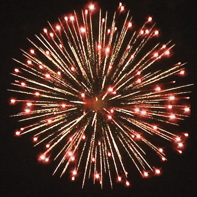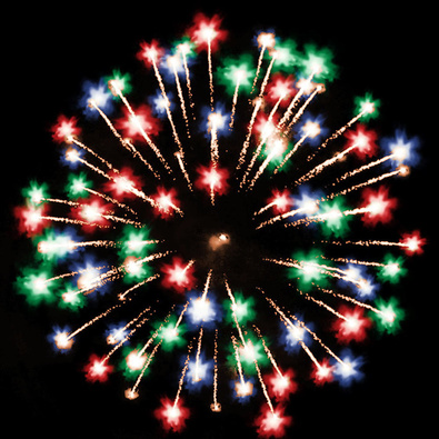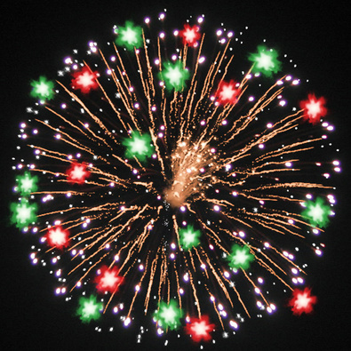 Разноцветные кометы разрываются сферами из цветных мерцающих огней с множеством трещащих сфер и серебряных форсов , переходящих в золотые искры.