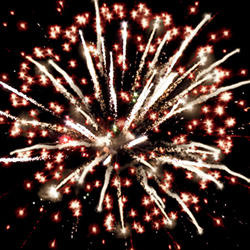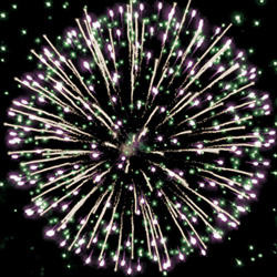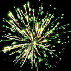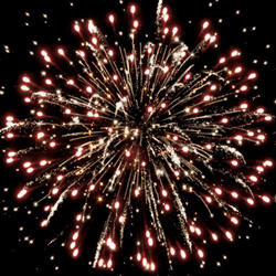 Разноцветные кометы, золотые искристые трассы разрываются сферами из золотых форсов с цветными, мерцающими и трещащими огнями на концах.