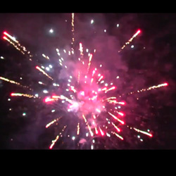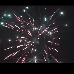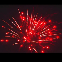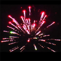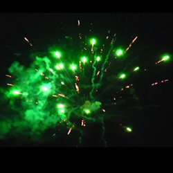 Красные грохочущие кометы вылетающие поочередно с зелеными кометами, раскрывающимися в золотые пальмы, брокады с зеленым мерцанием. Синие кометы с фиолетовым шлейфом переходящие в золотые пальмы с красным мерцанием и финал из грохочущих комет, переходящих в золотые парчовые пальмы.