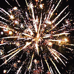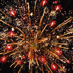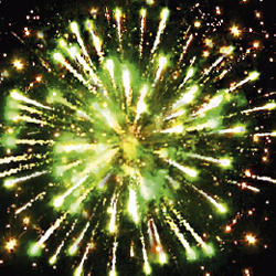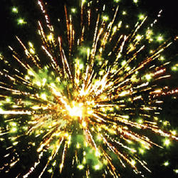 Серебряные, разноцветные звезды с пышными хвостами. Золотое и цветное мерцание. Множество серебряных ниспадающих нитей. Сфера золотых хвостов и облако треска.