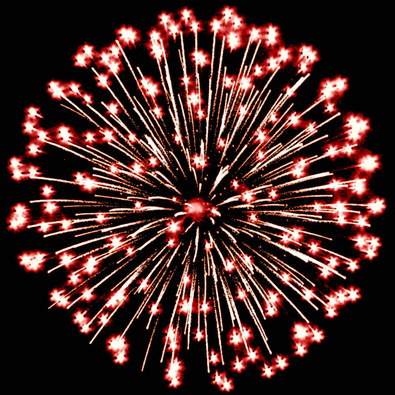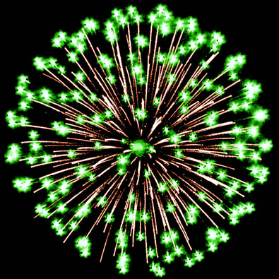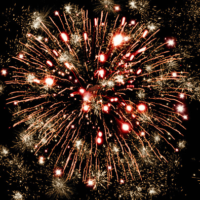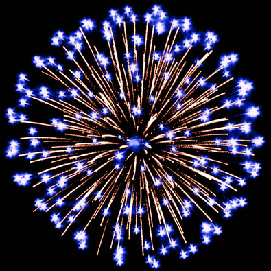 Разноцветные кометы, золотые трассы разрываются сферами из золотых искристых форсов и цветных мерцающих огней с искрами и множеством трещащих сфер.