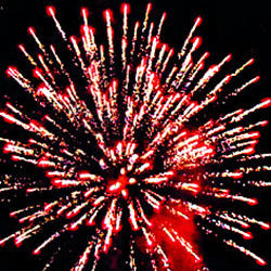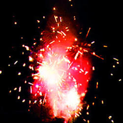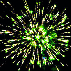 Фонтан: Красные огни и треск. Выстреливает салюты: Зеленые звезды с пышными хвостами (кокос). Красные звезды с пышными хвостами (кокос). Облако трещащих разрывов (трещащая хризантема).