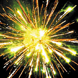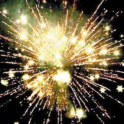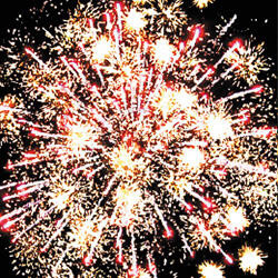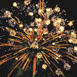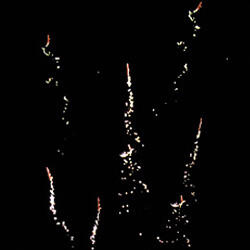 Цветные звезды с пышными хвостами и разноцветное мерцание. Золотая парча. Свист. Множество золотых ниспадающих нитей. Шуршащие разлетающиеся кометы. Красочная концовка.