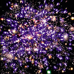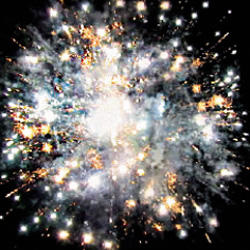Разноцветная мерцающая сфера. Цветные звезды и облако треска. Множество золотых ниспадающих нитей.