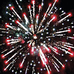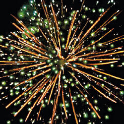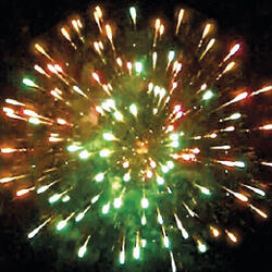 Залп хаотично разлетающихся огней. Множество золотых и серебряных ниспадающих нитей. Цветное мерцание. Разноцветные звезды с пышными хвостами. Облако треска.