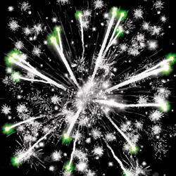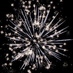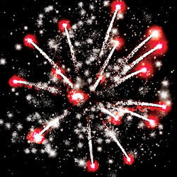 Разноцветные кометы разрываются сферами из серебряных форсов с цветными огнями на концах и множества трещащих огней.