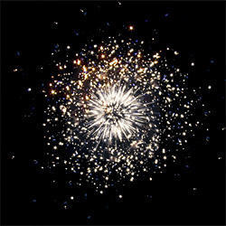Разноцветные кометы разрываются сферами из золотых и серебряных форсов с цветными мерцающими огнями.