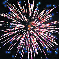 Множество серебряных ниспадающих нитей (парча) с красными звездами на концах и белое мерцание. Множество серебряных ниспадающих нитей (парча) с синими звездами на концах. Красно-белая мерцающая сфера (пион). Множество золотых ниспадающих нитей (парча) и зеленые, фиолетовые звезды. Желто-красная сфера (пион) и треск.