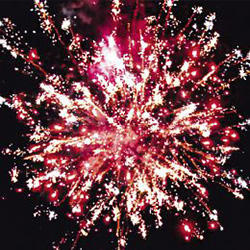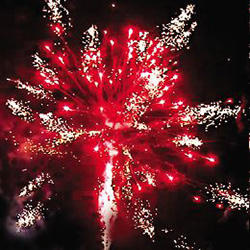 Множество серебряных ниспадающих нитей (парча) с красными и зелеными звездами на концах и треск. Разрыв шуршащими хвостами (снежные хлопья) и красным мерцанием. Красные и зеленые звезды с пышными хвостами (кокос) и облако треска (трещащий дождь). Красно-сине-белая мерцающая сфера (пион). Красочная концовка. ЗАЛП: Трещащие золотые хвосты (трещащая ива) и красное мерцание.