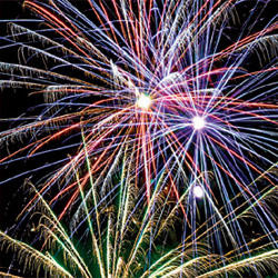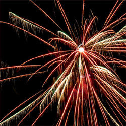 Разноцветные, свистящие кометы разрываются сферами из цветных, мерцающих и трещащих огней с золотыми и серебряными форсами. Красочная концовка из нескольких залпов.
