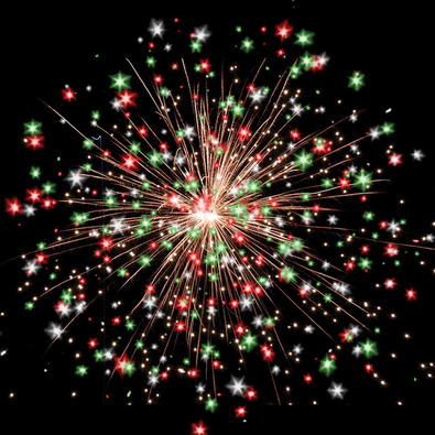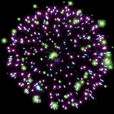Разноцветные кометы разрываются сферами из цветных мерцающих и трещащих огней.