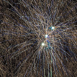 Разноцветные кометы разрываются множеством трещащих сфер и сферами из цветных огней.