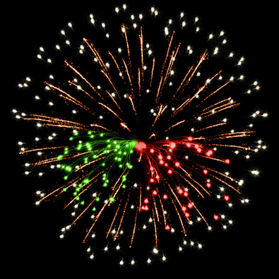 Разноцветные кометы разрываются сферами из: Золотых форсов и синих огней. Золотых форсов, синих и фиолетовых огней. Золотых форсов, красных и зеленых огней. Золотых форсов, фиолетовых огней и множества трещащих сфер. Золотых форсов, серебряных мерцающих огней и множества трещащих сфер. Золотых форсов, серебряных мерцающих огней с букетиками из красных и зеленых огней в центре. Золотых искристых форсов с трещащими искрами и красных мерцающих огней.