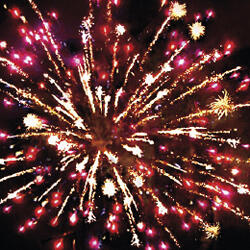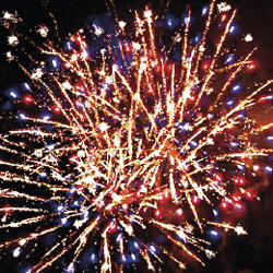 Серебряные звезды с пышными трещащими хвостами и разноцветные огни. Веер: цветные кометы переходят в трещащий разрыв.