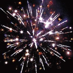 Разноцветные, серебряные звезды с пышными хвостами. Ооблако треска. Цветное мерцание. Залп всех эффектов.