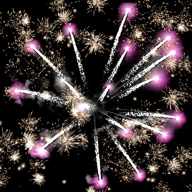 Разноцветные кометы разрываются сферами из серебряных форсов с цветными мерцающими огнями и множеством трещащих сфер.