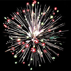 Разноцветные кометы разрываются сферами из золотых и серебряных форсов с цветными мерцающими огнями и с трещащими искрами на конца.