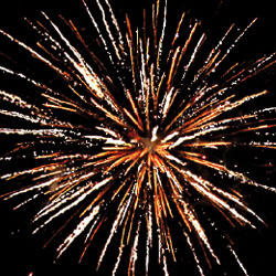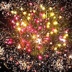 Разноцветная мерцающая сфера. Множество золотых и серебряных ниспадающих нитей. Цветные звезды с пышными хвостами и треск.
