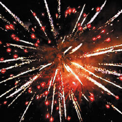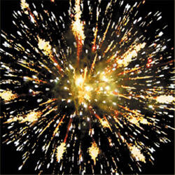 Разноцветные сферы и облако треска. Множество золотых и серебряных ниспадающих нитей и цветные звезды.Трещащая комета разрывается серебряными звездами с пышными трещащими хвостами и мерцанием.
